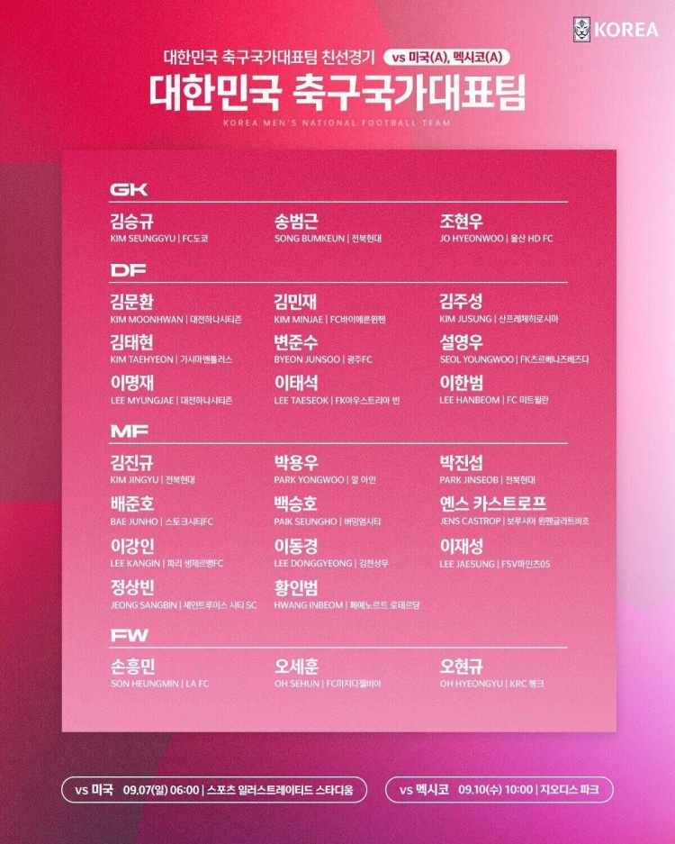 8月25日,韩国国家队正式公布了新一期集训名单,由孙兴慜、李刚仁与金玟哉等核心球员领衔,归化球员卡斯特罗普(门兴)首次获得征召。球队将于9月前往美国,分别与美国队及墨西哥队进行国际友谊赛。