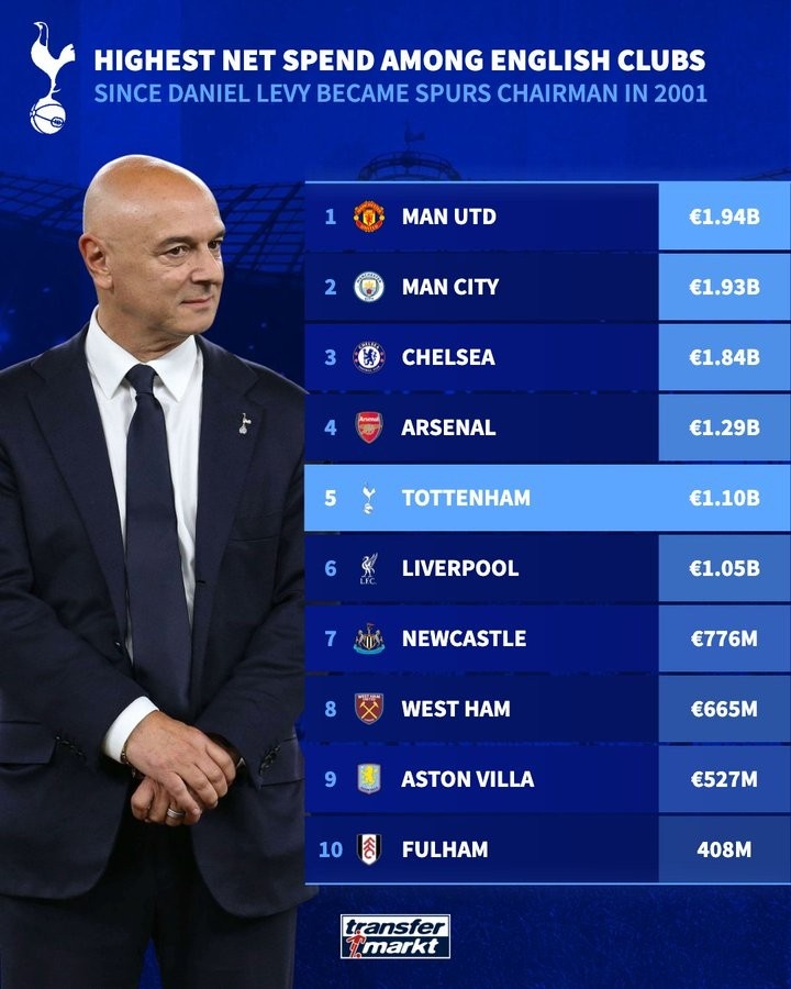 9月5日讯 德转统计,自列维2001年加入热刺后,英格兰同期只有4支俱乐部在转会市场净投入比热刺更多。