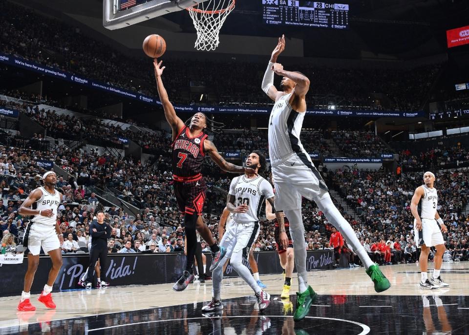 马刺过去8场豪取8连胜,公牛过去3场遭遇3连败,本赛季首次交锋马刺客场121-117战胜公牛。本场马刺缺少加西亚,公牛缺少西蒙斯、麦克朗、科林斯等多位球员。首节开局马刺4-8落后,马刺连得4分追平,双方缠斗至马刺10-12落后,马刺连得5分反超3分。公牛也连得5分,文班亚马引领一波7-0攻势夺回领先,公牛也连得7分再度反超,马刺打出7-3攻势,首节结束马刺29-28领先公牛。首节公牛22中11,其中三分10中5;马刺30中13,其中三分8中2,文班亚马9中5得到10+6+1帽。